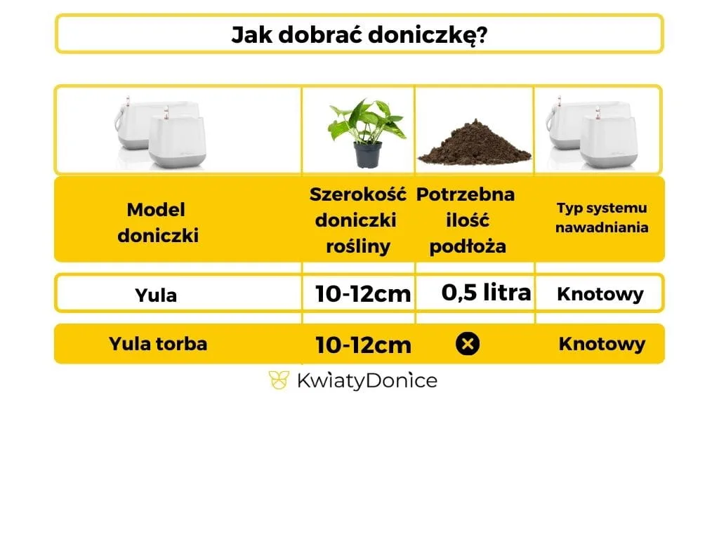 Tabela przedstawia jaką wielkość donicy dobrać do rośliny oraz ile podłoża będzie konieczne do przesadzenia.