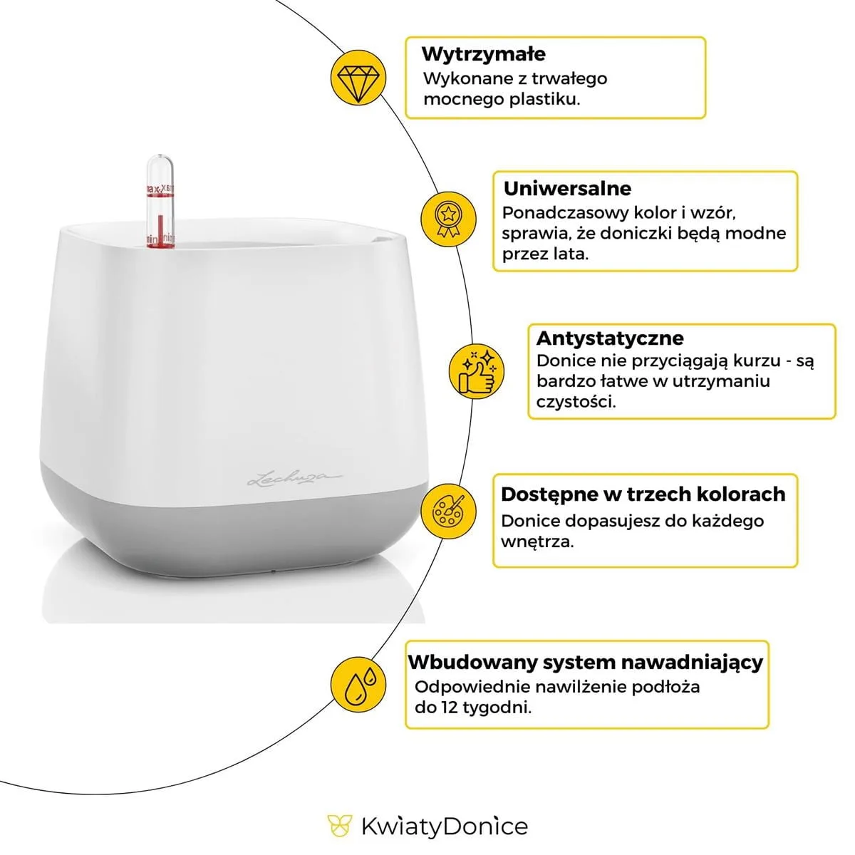 - Dzięki prostej konstrukcji donicy roślinę można w łatwy sposób umieścić w donicy