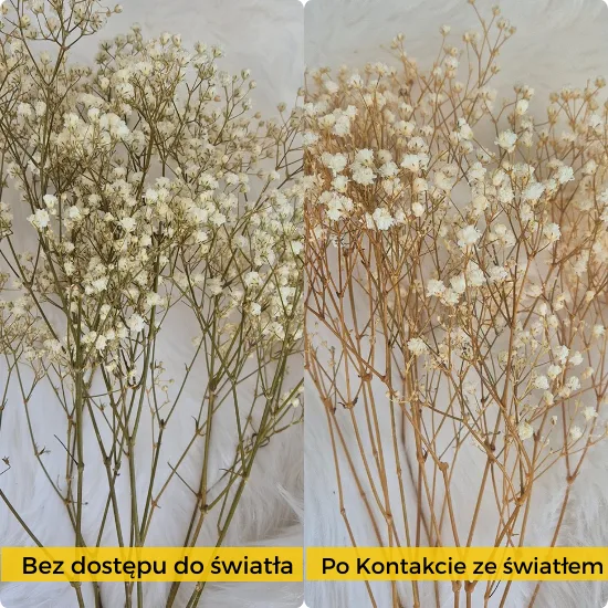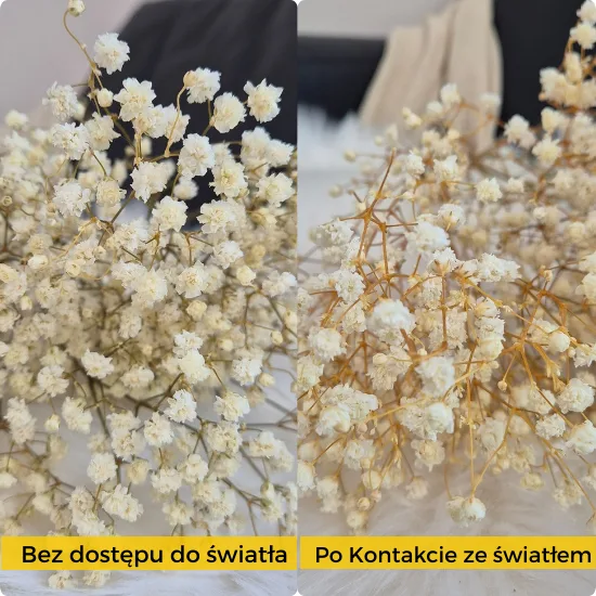 - Zmiana barwy: W przypadku białej gipsówki naturalnym zjawiskiem jest stopniowa zmiana koloru łodyg z zielonego na słomkowy/beżowy. Wynika to z utleniania się chlorofilu pod wpływem światła. Nie jest to wada produktu ani oznaka uschnięcia, lecz naturalna cecha roślin stabilizowanych.