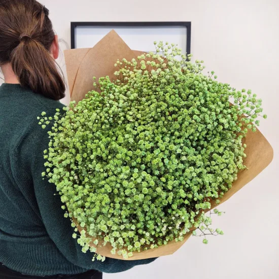 Bukiet 20 gałązek stabilizowanej gipsówki zapakowany w ekologiczny papier ozdobny oraz wstążkę.