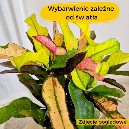 Wybarwienie liści krotonu zależy od różnych czynników pielęgnacyjnych, ale szczególnym jest intensywność światła. Kroton zmienia swoje kolory w zależności od ilości światła, które otrzymuje. Jeśli postawisz go w jasnym, rozproszonym świetle, jego liście nabiorą intensywnych złotych, czerwonych i różowych odcieni. W ciemniejszych miejscach roślina straci te barwy i stanie się bardziej zielona. Pamiętaj, aby unikać bezpośredniego słońca, które może poparzyć liście – najlepiej zapewnić mu dużo światła, ale w formie delikatnego, rozproszonego blasku.