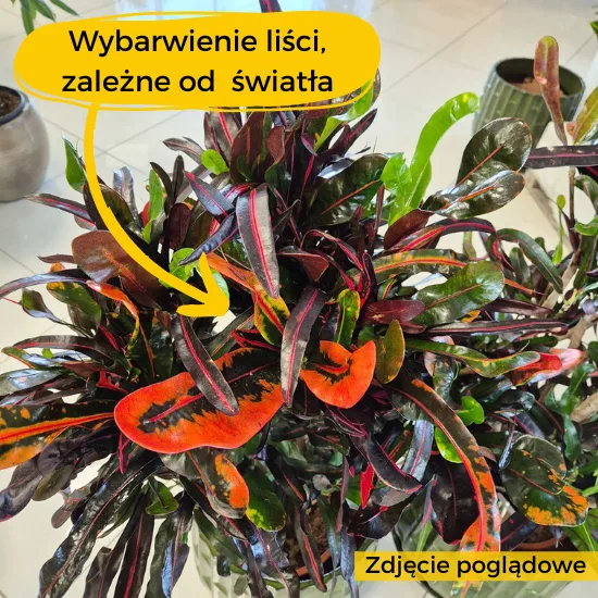 Wybarwienie liści krotonu zależy od różnych czynników pielęgnacyjnych, ale szczególnym jest intensywność światła. Kroton 'Mrs. Iceton’ zmienia swoje kolory w zależności od ilości światła, które otrzymuje. Jeśli postawisz go w jasnym, rozproszonym świetle, jego liście nabiorą intensywnych złotych, czerwonych i różowych odcieni. W ciemniejszych miejscach roślina straci te barwy i stanie się bardziej zielona. Pamiętaj, aby unikać bezpośredniego słońca, które może poparzyć liście – najlepiej zapewnić mu dużo światła, ale w formie delikatnego, rozproszonego blasku.