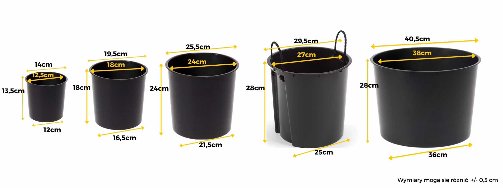 Rozmiary dobrane są na podstawie wymiarów donic produkcyjnych roślin. Ilość potrzebnego podłoża liczona bez rośliny.