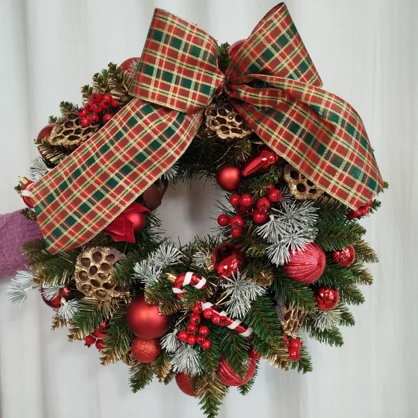 Wianek na drzwi świąteczny bożonarodzeniowy sztuczny z kokardą w kratę 50cm