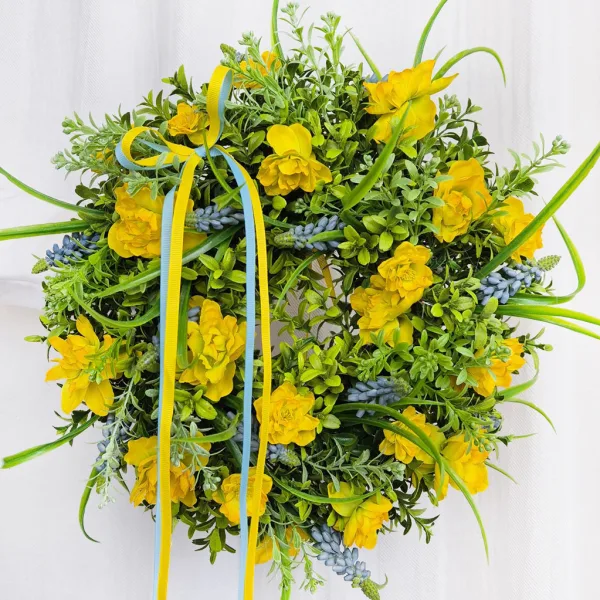 Wianek na drzwi wiosenny ze sztucznych żółtych kwiatów ręcznie robiony 35cm